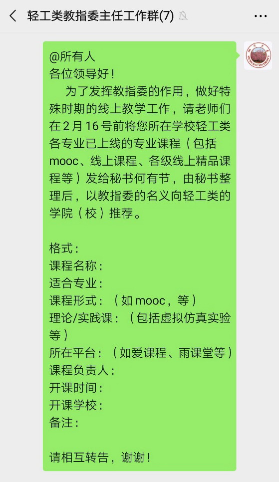 为认真贯彻落实新冠肺炎疫情防控背景下“停课不停教、停课不停学”的指示精神和工作要求,全力保障各轻工类专业有序开展在线教学工作,四川大学轻工科学与工程学院作为教育部高等学校轻工类专业教指委主任委员单位,在教指委主任石碧院士的组织策划下,�2�10日起收集整理全国轻工类各高校的在线专业课程资源,经教指委主任网络会议集中审议通过后,以轻工类教指委的名义向全国轻工类院校及专业推荐使用,并得到各轻工类院校及专业的积极响应和推广�