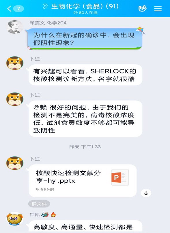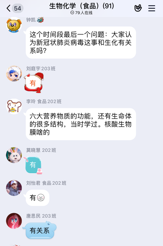 有效启发学生创新思维,不仅是课堂教学肩负的责任,更是当下亟待解决的难题。任课教师们把当前的社会热点有效融入授课内容,通过深挖热点现象与专业知识之间的联系,引导学生积极拓展思维空间。《食品生物化学》任课教师钟凯副教授、卜迁副研究员依�MOOC和腾讯课堂,在课程内容中融合新冠病毒的相关知识,引导学生打开思考的阀门,激发学生的学习兴趣和对专业的认可度�