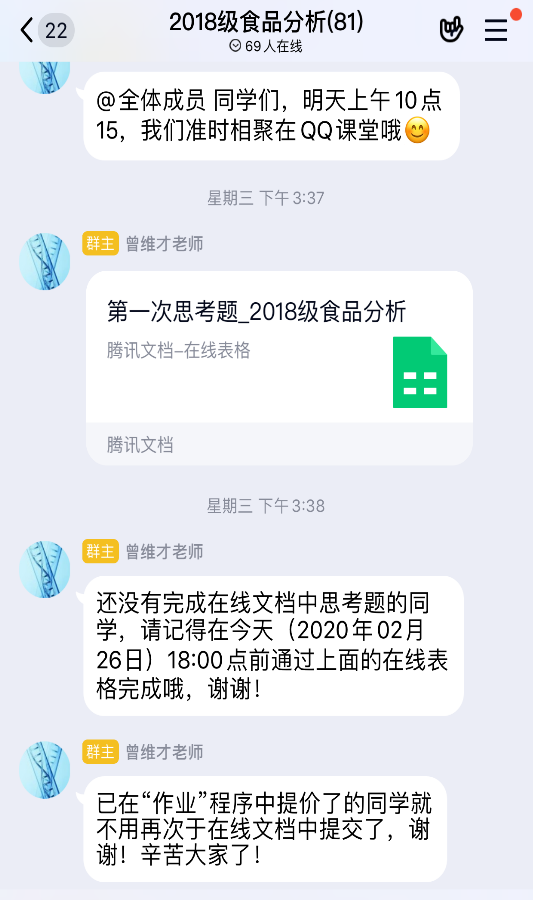 为确保线上教学有序开展,任课教师普遍提前半个月认真研究线上教学的特点并有针对性地做好授课准备,包括提前建好课程群,收集、整理、上传教学资料(教学大纲、电子版教材、课件、参考书籍等)。开课期间,严格按照教学计划开展线上教学工作,包括认真发起签到、组织讨论和布置课后作业。