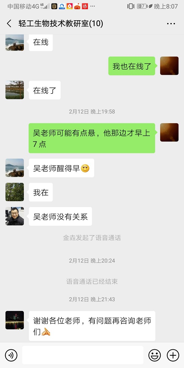 为更好地开展新学期教学工作,2020年2月12日20:00轻工生物技术教研室利用微信语音召开了新学期教学工作安排交流会,教研室所有任课教师出席会议,会议由教研室主任周荣清老师主持。