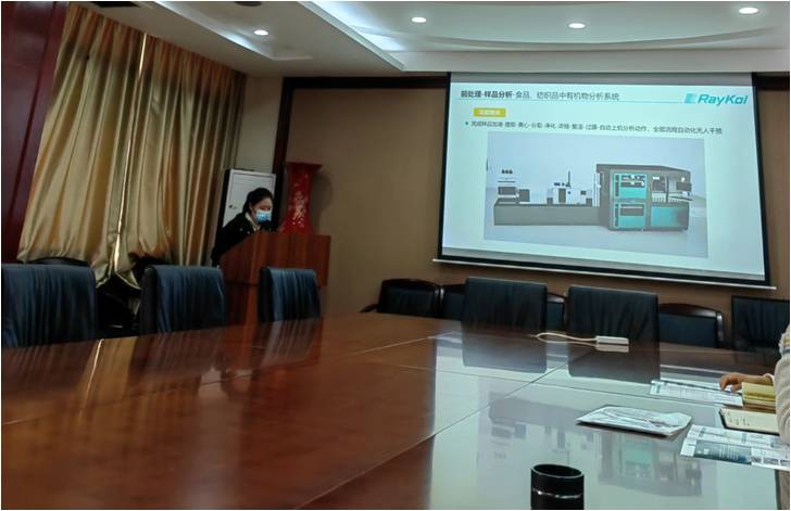 睿科集团文丹阳专员首先介绍了睿科集团公司的发展历程、科研实力、产品与服务以及主研的产品;然后详细介绍了自动化集成工作站、全流程智能化实验室的情况。其中多功能样品制备工作站ISP700具有高通量、无人化、多功能的特点,在前处理样品分析方面,有无机全流程自动化检测平台和有机物分析系统,可以完成样品加液-提取-离心-分取-净化-浓缩-复溶-过膜-自动上机分析动作,全部流程自动化无人干预;可以根据客户需求,任意添加模块,如均质模块、倾倒模块、真空平行浓缩模块、涡旋振荡模块、称量模块、高速离心等等。会议中,双方人员对无机物、有机物的样品前处理技术、全流程智慧实验室等内容进行了深入探讨。