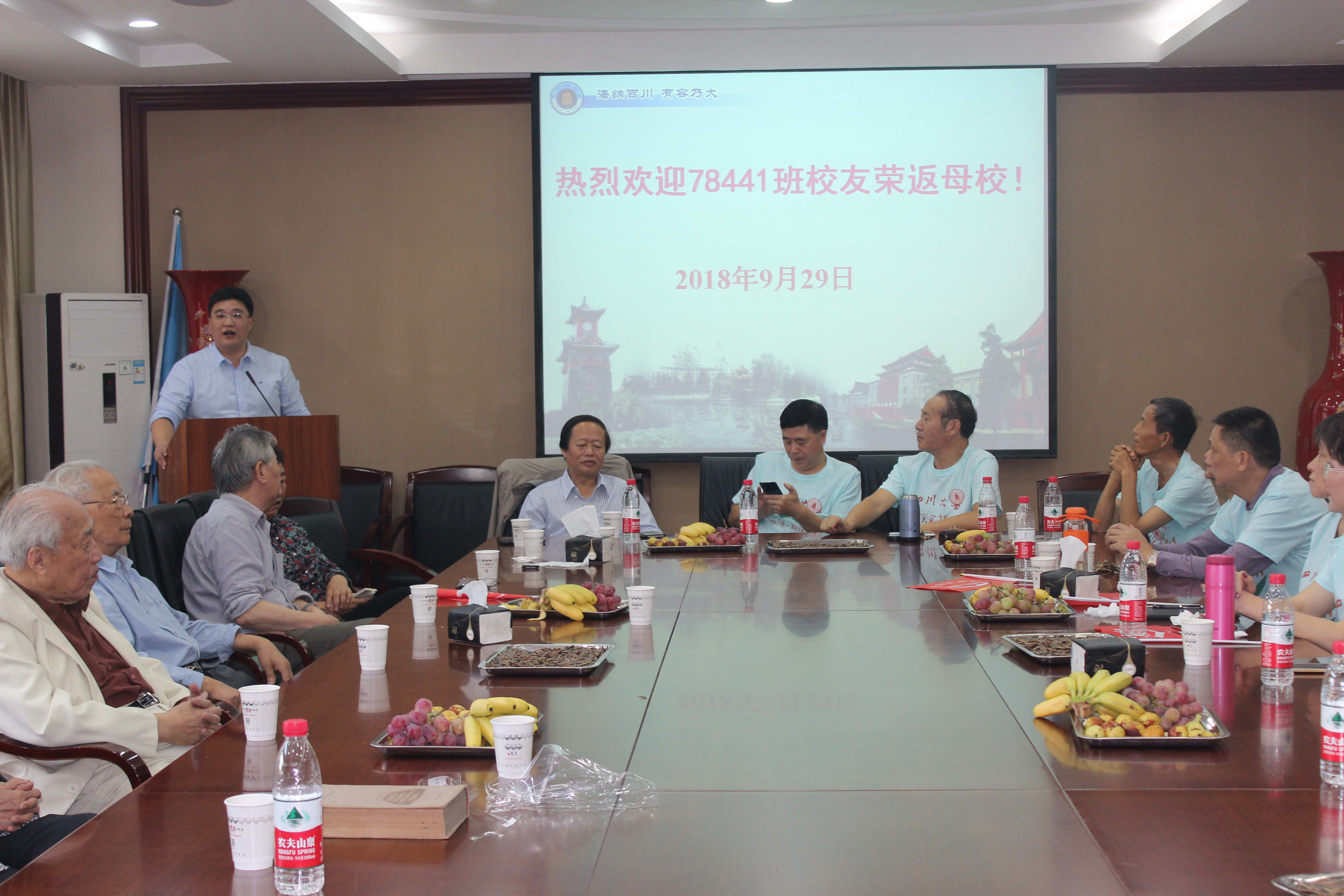 在母校122周年校庆之际,成都科技大学78441班同学举行入学四十周年荣归母校活动。2018年9月29日上午,班级30余人在皮革楼209会议室欢聚一堂,共同回忆大学时光和同学情谊。出席活动的有中国工程院院士石碧教授(78441班同学)、退休教师张扬教授、陈彦教授(78441班同学)、王坤余教授、傅师申教授、杨淑娟老师、轻纺与食品学院原院长廖隆理教授、原院长陈武勇教授以及轻纺与食品学院刘晓虎书记、何有节院长、生物质与皮革工程系主任林炜教授、张廷有教授、张宗才教授(78441班同学)师等。本次活动由78441班原班长陈彦和李元庆同学主持。
