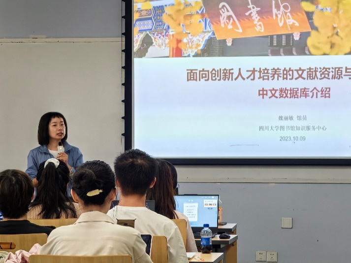 在教学过程中,魏丽敏老师向学生们介绍了我校图书馆提供的中文数据库资源和服务网站,其中包括“中国知网”、“万方数据库”、“维普数据库”等。她以草木染为主题,示范了文献检索的基本步骤。
