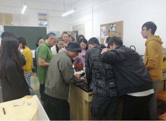 师生座谈交流,接着在生物质与皮革工程系张金伟老师的陪同下,参观了相关实验室,了解皮革材料的制备工艺等。之后他来到纺工楼5楼的服饰配件实验室,与服装与服饰设计专业的同学就皮包设计图的结构、材料的选用及制作等进行了深入探讨。他以自己设计的背包为例,阐述了其设计理念与制作工艺,包括负重背包选用皮材的特点,装钉的位置等关键细节都一一给师生们作了讲解。