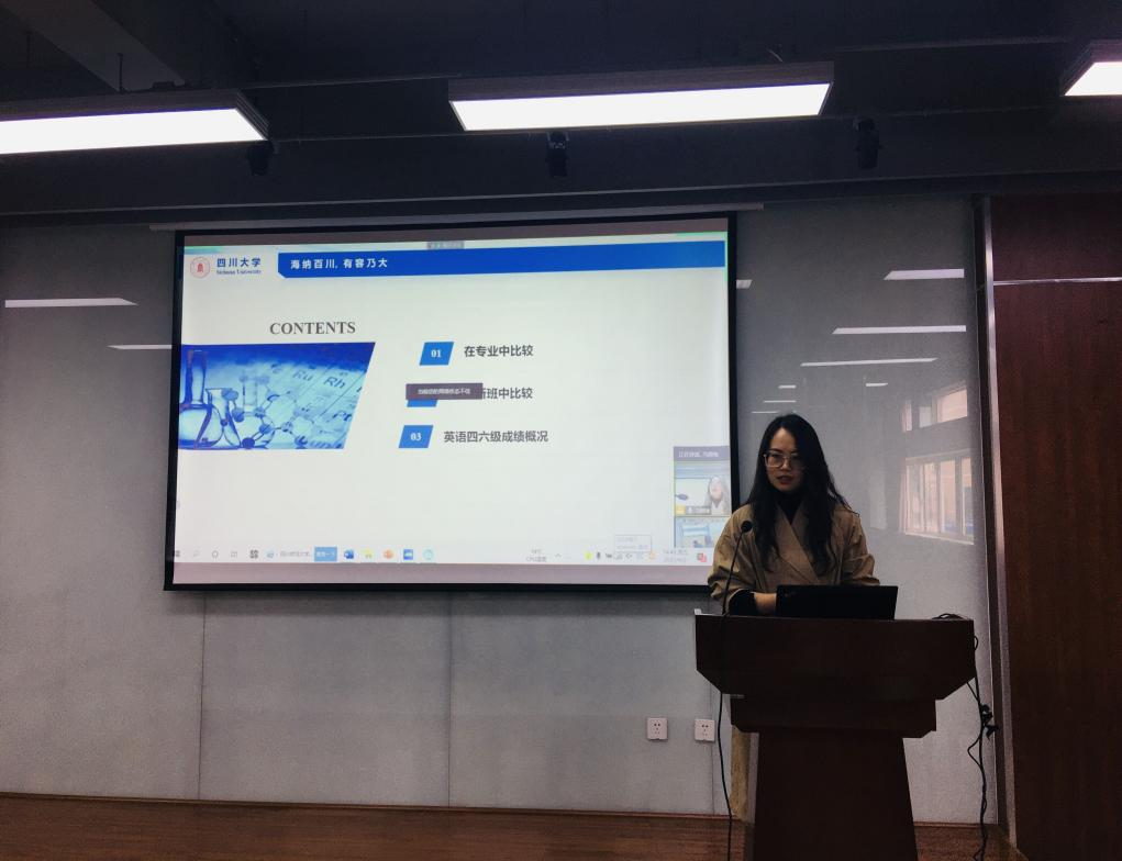2018级辅导员杨维老师�2019级辅导员贺婷老师分别�普通班与创�班比较、创新班内不同专业比较�英语四六级成绩等方面向与会人员做了创新班学生成绩分析�