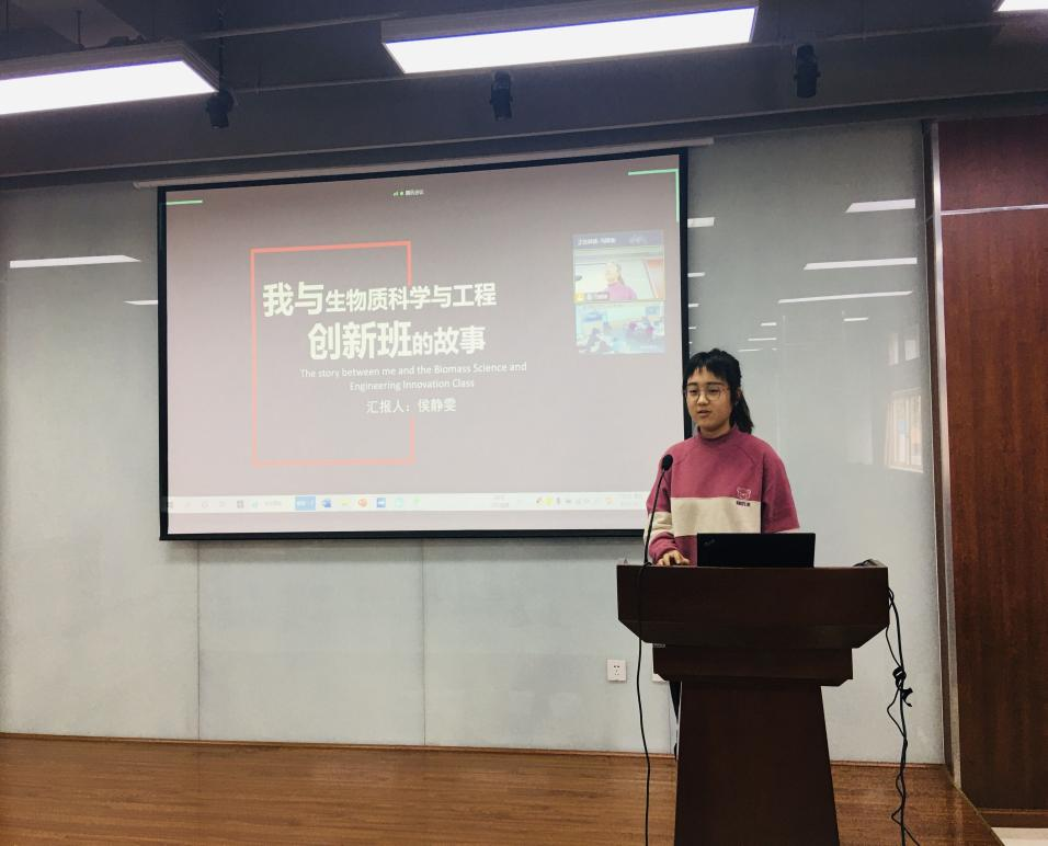 来自2018级轻化工程专业侯静雯同学从人生初理想、走过的那些路、所得与所悟、未来的小目标四个方面向与会人员真挚分享了与创新班的故事。最后,侯静雯同学以“不倒翁”精神与同学们共勉,号召大家保持自信和微笑,遇见更好的自己�