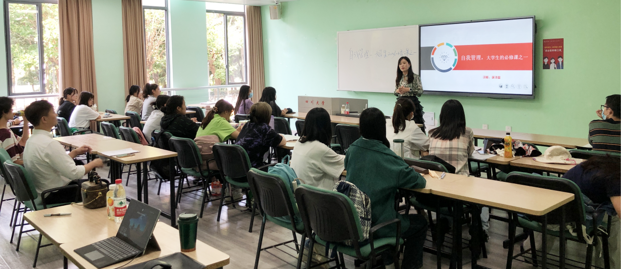 谢沛霖老师首先组织同学们进行了行为特质动态衡量系统性格测试,随后有针对性的从自我认知、目标管理、时间管理、情绪管理四个方面讲解自我管理意识的养成,鼓励大一新生在成长中学会把握学习的时、度、效。