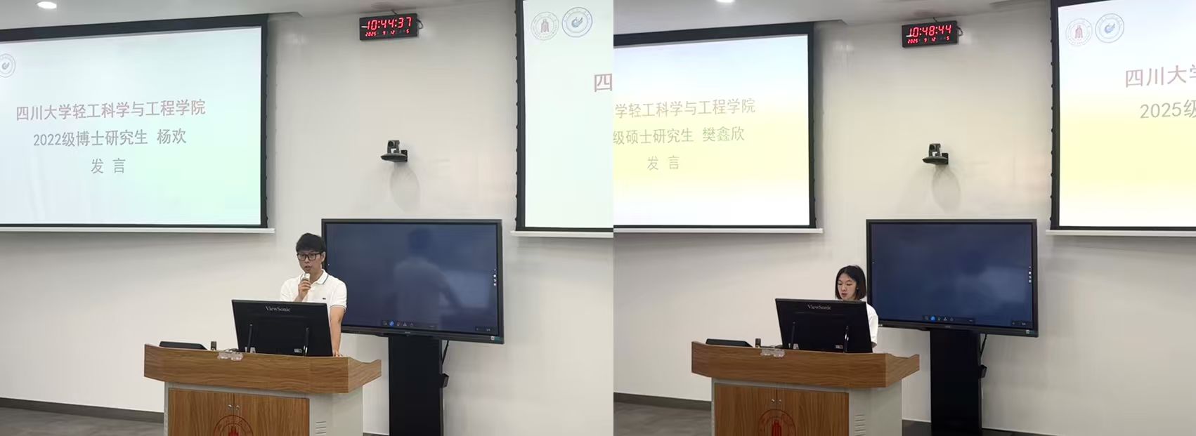 博士研究生代表杨欢和硕士研究生代表樊鑫欣分别发言,分享了对科研生活的期待与规划,呼吁大家珍惜在川大的学习机会,恪守学术道德,勇攀科学高峰,不负学院和老师的培养与期望。