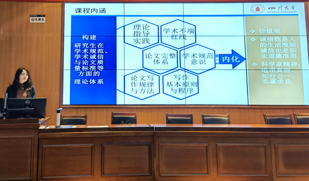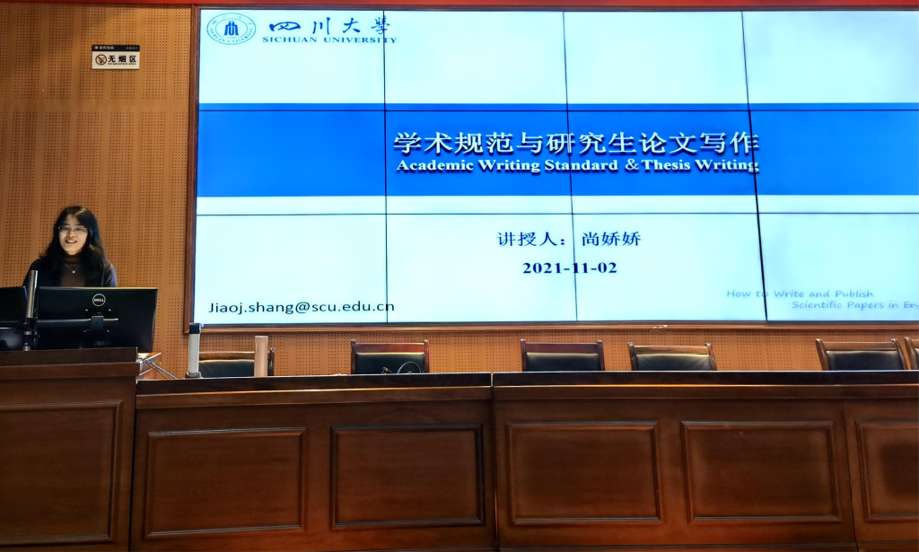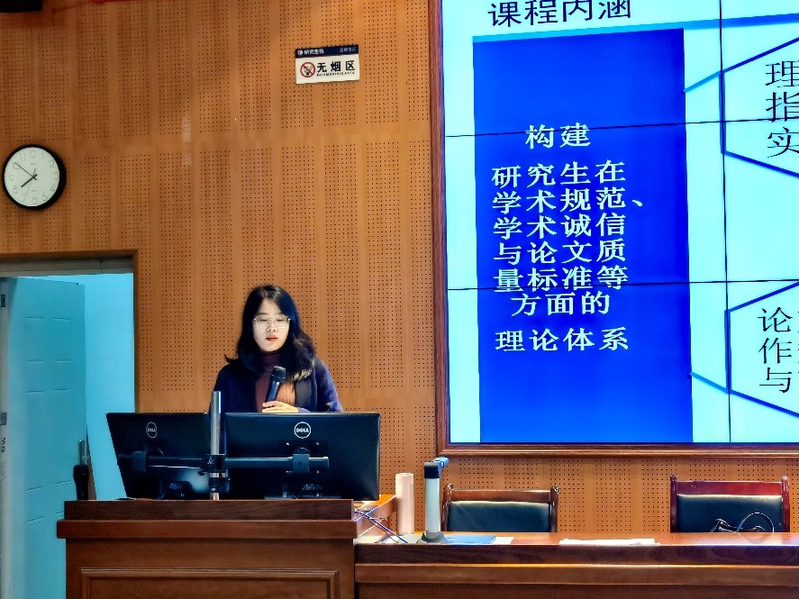 诚信教育教学课件展示及优秀主讲教师评选活动的通知》文件要求。2021年11月2日晚19:30,尚娇娇老师于研究生院2区101讲授了《学术规范与研究生论文写作指导》课程,现场共有百余名硕士研究生和博士研究生进行学习。