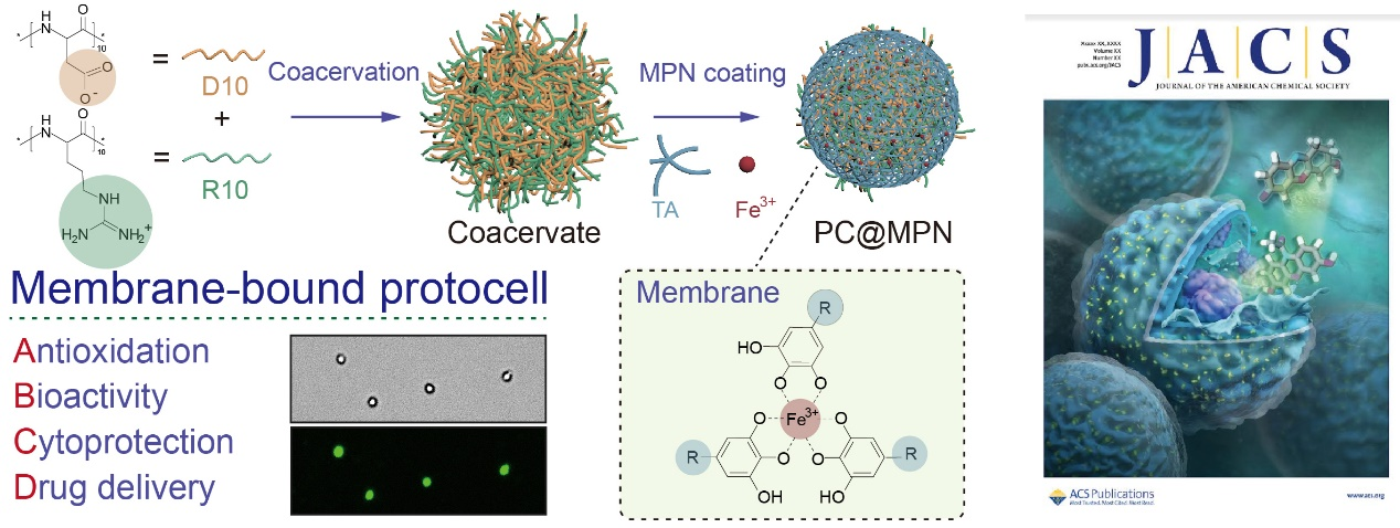 周加境研究员与华西口腔医学院刘磊教授、墨尔本大学Frank Caruso教授团队合作,开发了一种基于凝聚体和金属多酚网络的新型原始细胞模型(peptide coacervate@metal−phenolic networks,PC@MPNs),并证明了其作为药物递送平台的潜力,该研究成果以题为“Peptide-Based Coacervate Protocells with Cytoprotective Metal−Phenolic Network Membranes”发表于国际化学顶级期刊《Journal of the American Chemical Society》(影响因子16.383;川大A-),并入选封面论文。研究以相反电荷寡肽形成的凝聚体模拟细胞质,利用金属多酚网络模拟细胞膜,构建了一种新型的原始细胞系统PC@MPNs。这种原始细胞能高效地负载各种生物活性大分子,如牛血清白蛋白和免疫球蛋白G。同时,金属多酚网络细胞膜不仅能够稳定凝聚体,还赋予原始细胞选择透过性以及优异的自由基清除能力。该PC@MPNs能够模拟细胞信号传递进行生物催化级联反应,并通过表面修饰各类功能分子进一步模拟真实细胞的结构。研究证明,负载抗癌药阿霉素并被叶酸修饰后的PC@MPNs可被用于治疗鳞状细胞癌,具有作为药物递送平台的巨大潜力。