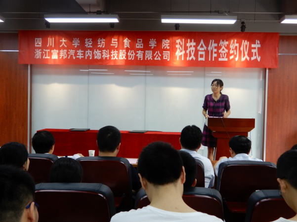 2018�5�18日上�10:30,四川大学与浙江富邦汽车内饰科技股份有限公司科技合作签字仪式在皮革楼报告厅隆重举行。四川大学轻纺与食品学院党委刘晓虎书记、轻纺与食品学院院长何有节教授、浙江富邦汽车内饰科技股份有限公司��董事�、四川大学科学技术研究院彭泽龙科长�四川大学生物质与皮革工程系主任林炜教授��党支部书记程海明教授、资�皮革专家但卫华教授、皮革系办公室邱华军主任和皮革工程教研室主任但年华副教授�出席了签约仪��
