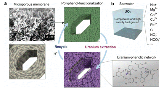 石碧院士课题组通过皮革、化工、材料等多学科的交叉融合,利用铀能高选择性的与多酚形成稳定配合物的原理,将植物多酚(单宁)固定在微孔滤膜上,构建出了通量大、选择性高、可多次循环使用的海水提铀新型膜材料,解决了目前海水提铀中的高选择性及经济性等关键问题。