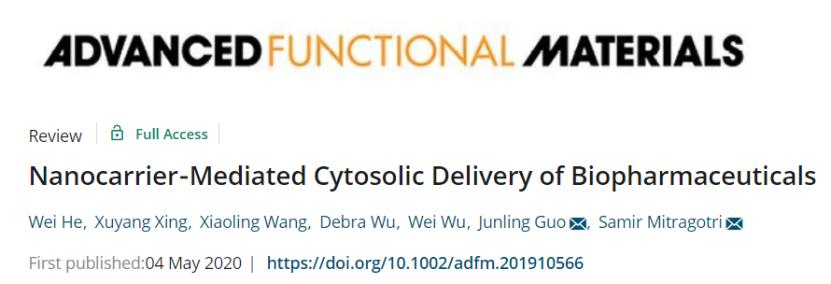 郭俊凌教授对该重要领域进行总结以及提出前瞻性展望。题为“Nanocarrier-Mediated Cytosolic Delivery of Biopharmaceuticals”的论文由AV研究所