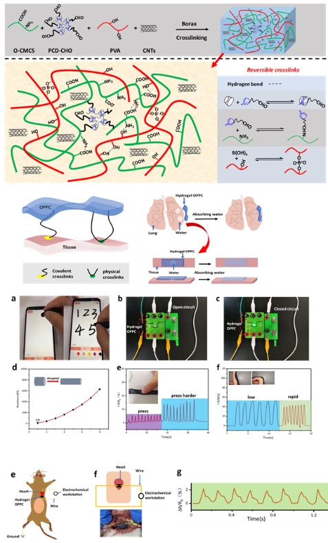 该团队后续又以羧甲基壳聚糖和β-环糊精等为基材,碳纳米管(CNTs)为填充物和主要导电物质制备了双网络水凝胶(硼酸酯键和Schiff base交联)。该水凝胶具有快速的自愈性、极高的自愈率(99%)、良好的机械性能及拉伸性、良好的细胞相容性和较高的灵敏性。此外,该水凝胶具有超高吸水率,可快速吸收湿组织表面的水分膨胀从而与组织形成良好的黏附作用。该双网络水凝胶通过组装成柔性传感器后除了用于监测人体的宏观运动外,还能很精确地贴附在小白鼠心脏(体内)监测其跳动(图3)。相关研究成果以AV研究所