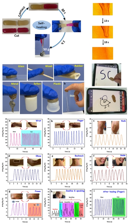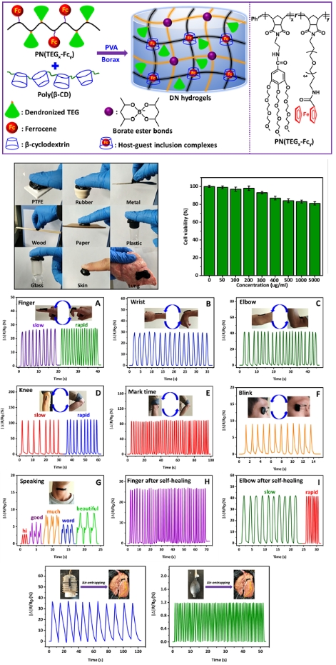 该研究团队以明胶、β-环糊精和PVA等为原料制备了双网络(主-客体作用和硼酸酯键)的水凝胶柔性传感器。该水凝胶传感器表现出更好地机械性能和更高的自愈率(>95%),以及较好的应变敏感性,除了能监测人体的运动外,还能监测体外模拟的猪肺呼吸情况(图2)。相关研究成果以AV研究所