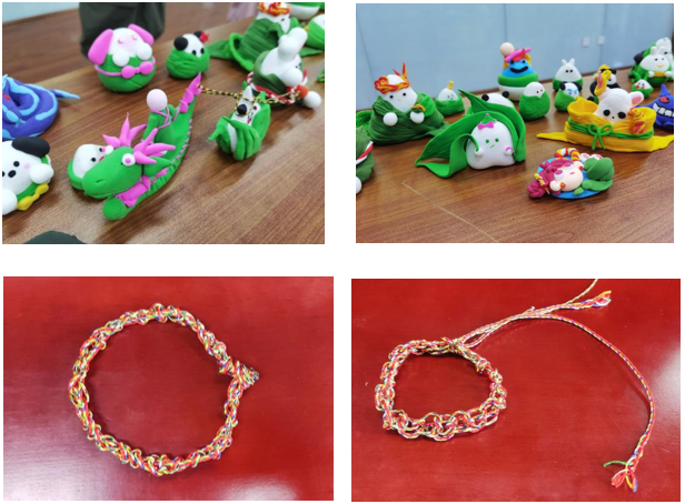 接着,为了体验传统节日,大家发挥自己的专业特长和兴趣爱好,用粘土制作粽子和与端午节相关的手工品。大家围坐在一起,讨论做粘土粽子的方法,发挥自己的想象,将自己的构思转化为形态各异的粽子、龙舟等手工品,有的精美,有的俏皮。做完“粽子”后,大家一起学习编手绳的技巧,并根据自己的喜好用不同的彩绳和手法编织,最后再戴在自己的手腕上以驱邪祈福。当一只只形态各异的粽子和多彩多样的手绳呈现在大家眼前时,大家感受到了DIY的成就感和中国传统文化的乐趣。