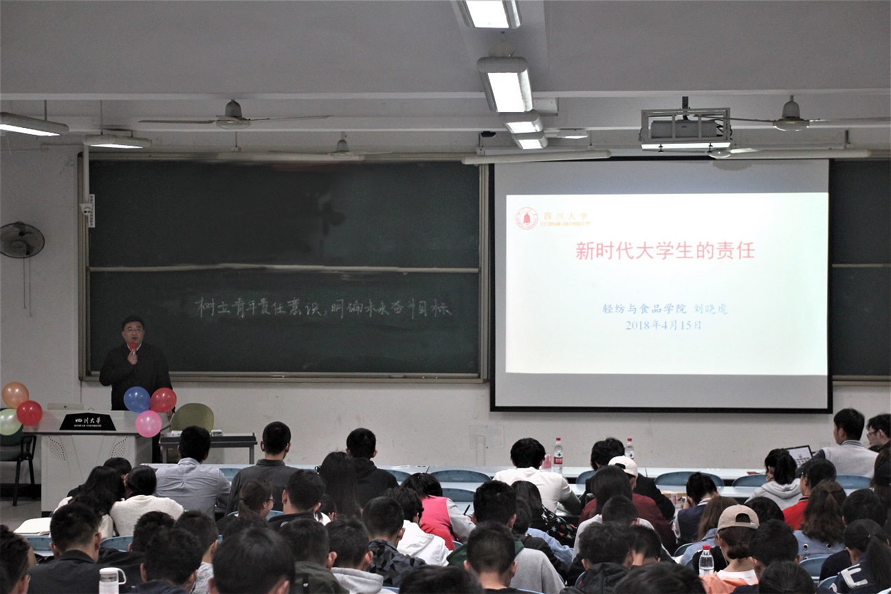 2018年4月15日晚,轻纺与食品学院党委书记刘晓虎副教授以“新时代大学生的责任与使命”为主题对AV研究所