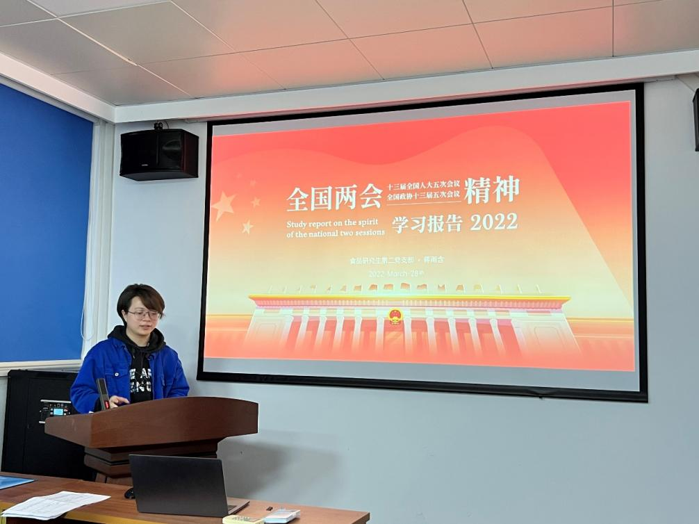 食品研究生第二党支部在纺工楼A302会议室召开了关于全国两会精神分享的学习报告会,报告会由支部书记杜沁岭同志主持,支部党员蒋雨含同志做主要分享。