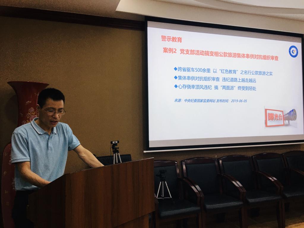 冯国涛副书记就学院2020年党风廉政教育宣传月相关工作进行部署;带领与会人员共同学习《中国共产党纪律处分条例》,重点学习《中国共产党纪律处分条例》的修订内容,倡议与会人员将铁的纪律真正转化为党员干部的日常习惯和行为准则;结合中央纪委国家监委通报的八起形式主义官僚主义典型问题、党支部活动搞变相公款旅游集体串供对抗组织审查、监守自盗的90后税收助征员三个典型警示案例开展专题警示教育,要求全体与会人员把清廉务实作风落实到各自岗位工作中。