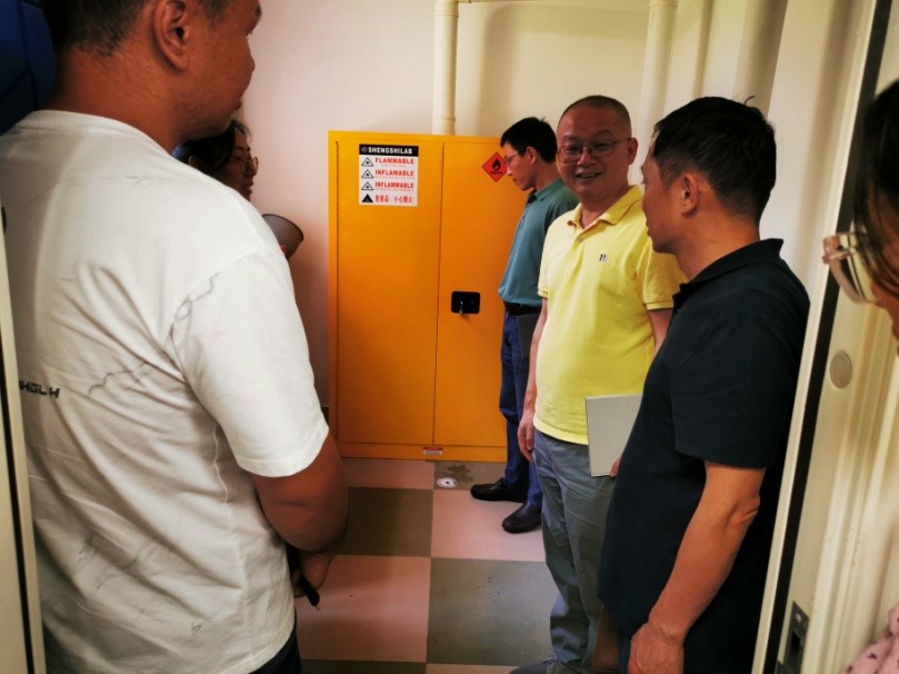 周建飞副院长对实验楼及各科研实验室的消防应急设施、用水用电安全、实验试剂管理和废弃物处置等情况进行了重点检查,发现部分实验室存在配电箱标识不清楚、实验废弃物处理不及时、实验室杂乱和气瓶管理不规范等安全隐患。检查组对能立行立改的安全隐患要求相关责任人现场整改,对不能立行立改的要求相关责任人提出整改方案和整改时间表,督促各责任人在放假前消除安全隐患。