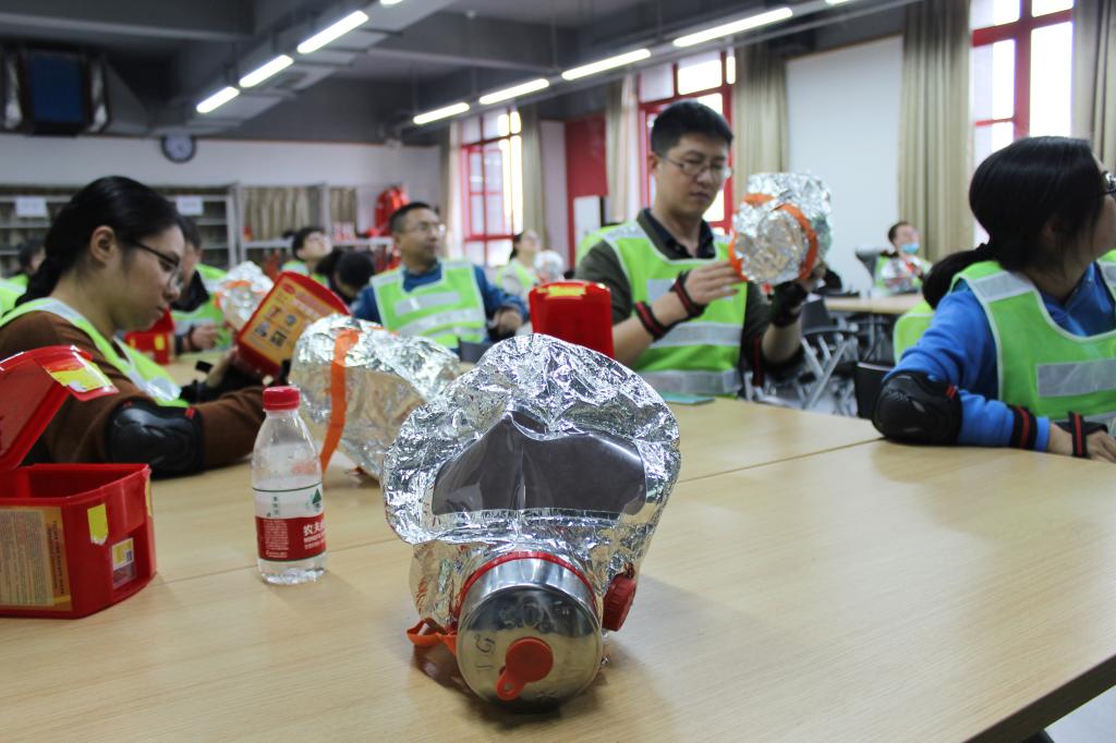 第一阶段的培训主要解决火灾是否有扑救的可能,在保证自身安全的前提下有效扑救;无法扑救时,应选择尽快逃生,并报警。第二阶段主要解决如何安全逃生的问题,安全指示牌的作用,出口的快速寻找,湿毛巾、呼吸面具的使用,低姿逃生,手背试温等知识;参加培训的老师相互协助体验了“模拟逃生”的过程。