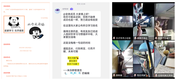 此外,思学中心通过选树高年级典型,以“他�-自助-互助”为运行机制,分别建立了英语、数学、物理、化学四个学习互助小组,朋辈导师每天进行学习打卡监督,每周开展一次线下交流沙龙,每月开展一次学习成效总结,帮助大一学生加强基础课程学习�