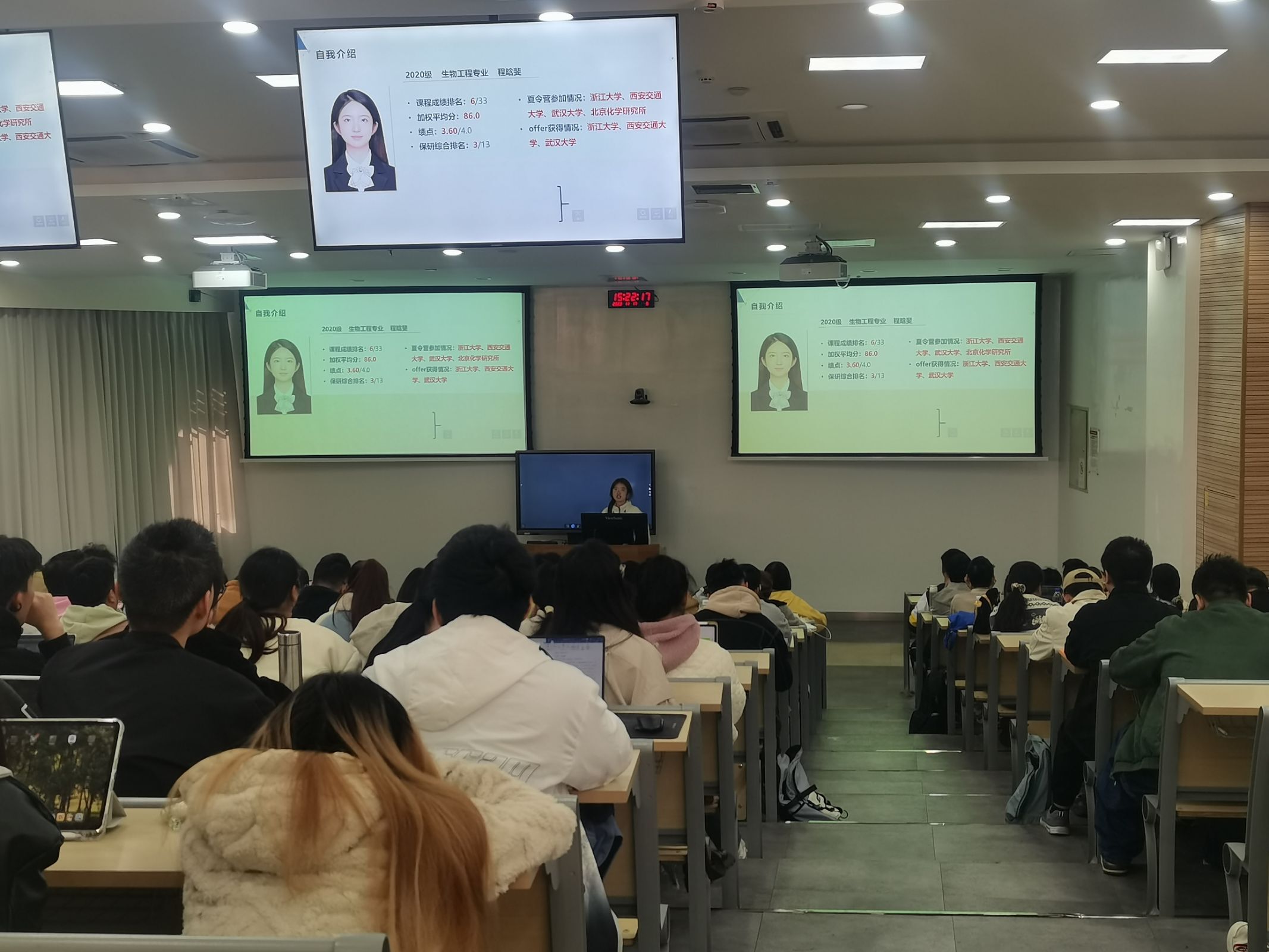 在望江校区,思学中心以“深造帮扶”为主题进行交流分享。轻化工程专业2020级本科生、思学中心副主任林硕就中心的运作机制、成员组成情况及负责项目进行了详细介绍,表示思学中心将“聚焦生涯规划、聚焦课程学习、聚焦创新能力”,与学院“六位一体”管理形成合力,为学生生涯发展做全程保障,助力学生成长成才。随后,生物工程专业2020级本科生程晗斐面向大三学生进行了保研经验分享。程晗斐同学在高校暑期夏令营期间收到了浙江大学、西安交通大学、武汉大学等高校的“橄榄枝”,并最终保研至浙江大学材料工程专业。程晗斐同学就核心课程的学习、高校夏令营、英语水平的提升和科研训练等方面进行讲解,帮助同学们梳理学业规划,同时提醒大家“保研是一场持久战,要积极调整状态,不到最后一刻不要放弃。”