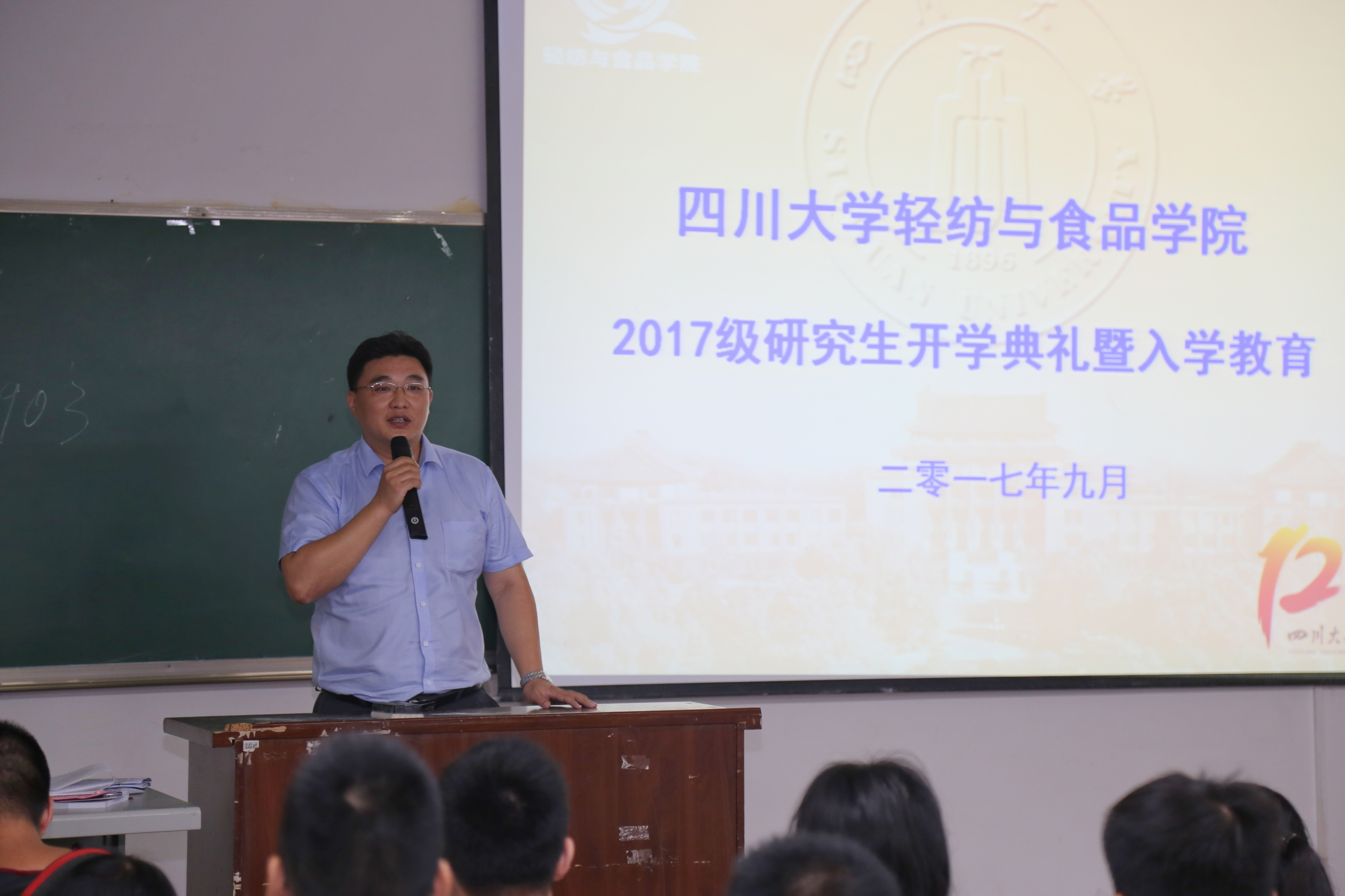 轻纺与食品学院2017级研究生开学典礼暨入学教育在纺工附楼205隆重举行。参加本次开学典礼的有学院党委书记刘晓虎副教授、院长何有节教授、生物质与皮革工程系副系主任林炜教授、食品工程系副系主任高鸿教授、纺织与服装工程系副系主任郭荣辉副教授、研究生教务员邓莎老师以及2017级全体研究生新同学。开学典礼由院学生科科长、研究生辅导员冯国涛老师主持。