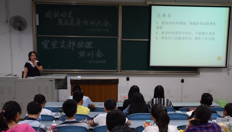 江安校区综合楼C座105教室顺利举行。本次活动由轻纺与食品学院团委学生会主办,团委副书记、2014级辅导员李晓秀老师,团委副书记、2015级辅导员贺婷老师参加了本次大会。全体2014级迎新志愿者到场接受志愿工作培训。