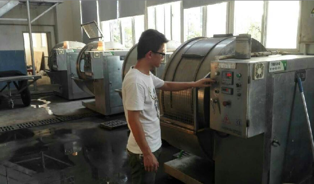 参加实习的同学,在周经理的带领下先住进了公司宽敞的宿舍,随后参观了公司生产部门。学生们首先来到挤水削匀车间,车间的右侧是三台挤水挤,右侧是六台削匀机,整个车间的八十多位工人熟练的进行中挤水和削匀工序。挤水是用挤压的方法除去蓝湿皮中的水分,削匀则是为了让皮的厚薄尽量保持均匀,以便在后续的复鞣染色加脂工序中各类材料能均匀渗透的更好。这两个工序看似简单,却是整个制革工艺中重要的一环,所以这个车间里的工人都是非常熟练的老手,只见一张张皮在他们手中展开、送入机器、抽出、折叠,足以体现他们老练的技术,同时他们脸上密布的汗水也显示这不是一份轻松的工作。