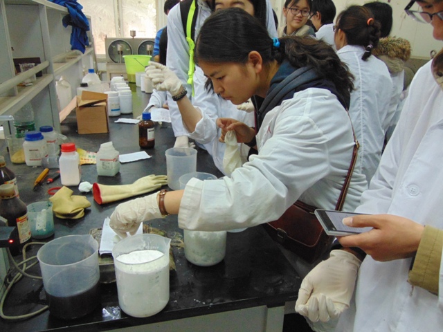 下午1时,同学们被分成11个小组,来到了皮革工艺实验室。在李峰学长为大家做了仪器操作的示范后,同学们便穿上实验服,带上手套,开始他们的Tanner之旅。同学们需要完成的实验是“加脂染色”,主要有中和与染色加脂两个步骤,每个步骤至少需要1个小时的时间。经过一个下午的亲身体验,每个同学都得到自己劳动成果——染成自己喜爱颜色的皮革。