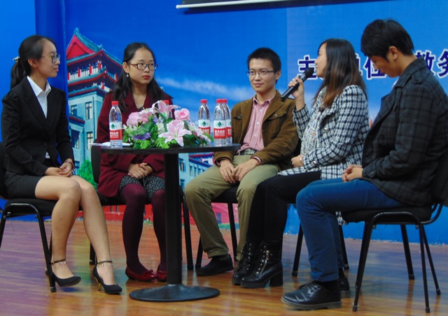 江安校区水上报告厅顺利举行。本次访谈活动邀请了2009级食品科学与工程专业优秀毕业生尹璐、2013级纺织工程硕士研究生董士华、2011级服装设计与工程专业学生孟虎、2011级轻化工程专业学生田赛琦作为访谈嘉宾,AV研究所