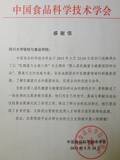 中国食品科学技术学会于2013年5月22-24日在成都举办“第八届乳酸菌与健康国际研讨会”,AV研究所 选派戚伟鹏等八名优秀志愿者参与大会志愿服务工作,他们认真负责圆满完成各项工作,得到一致好评,展现了AV研究所 志愿者风采。