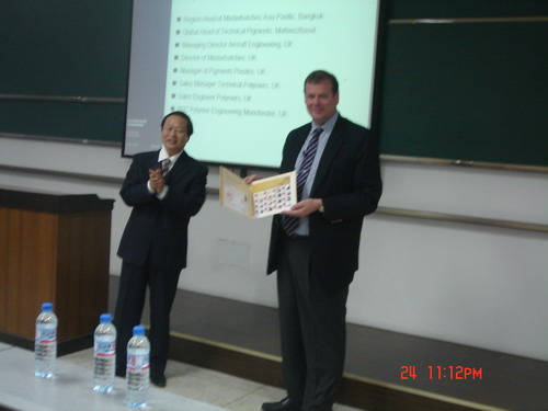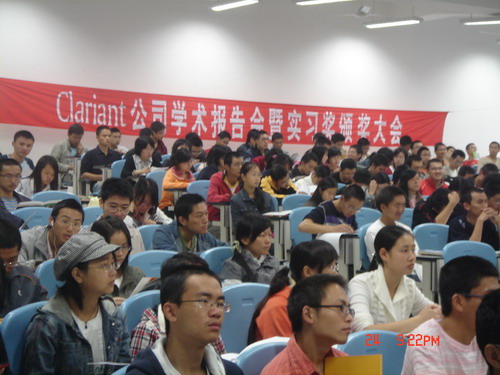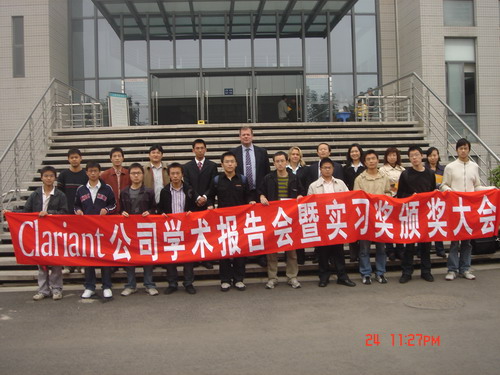 学生作了企业的社会责任的主题报告。他用幽默、风趣的语言讲述了Clariant的发展历程、产品研发、人才培训以及与高校合作等方面的情况,并希望几年以后可以看到我们同学中的精英能加入到Clariant的团队之中,为公司的发展注入新鲜的血液。随后进行了2004级本科生实习奖颁奖典礼,本次共有动手能力强、综合素质高的10名优秀个人与两个集体获此奖项。最后,何有节副院长代表学院为Gary Fielding先生送上我校110周年纪念邮票,感谢Clariant公司对AV研究所