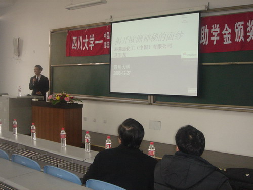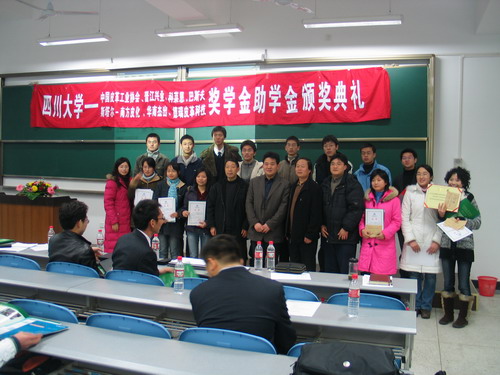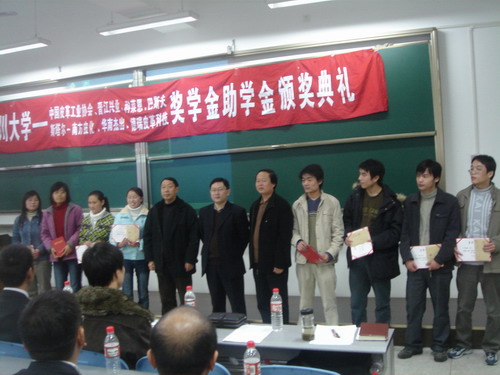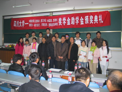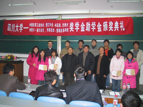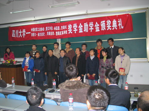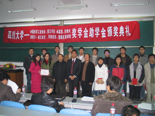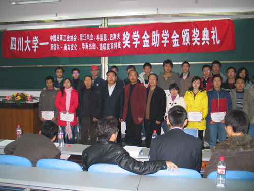 生物质与皮革工程系专业奖学金颁奖典礼在江安校区综合楼C304隆重举行,此次颁奖典礼共颁发七个项目的奖助学金,他们分别是:中国皮革工业协会奖学金、广东华南杰出奖助学金、斯塔尔-南方皮化奖助学金、德瑞皮革科技奖学金、科莱恩实习奖学金、BASF奖学金和晋江兴业助学金。参加本次颁奖典礼的人员有:设奖单位颁奖嘉宾,轻纺与食品学院院长、生物质与皮革工程系主任陈武勇教授,副院长何有节教授,院党委副书记刘晓虎老师,生物质与皮革工程系副系主任张宗才教授、刘彦副教授,生物质与皮革工程系杨淑娟老师、陈家丽老师,院学生工作办公室冯国涛、李晓秀老师,全体获奖学生,学院2005级、2006级全体轻化工程专业、轻工生物技术专业学生。颁奖典礼由院团委书记祝蔚老师主持。