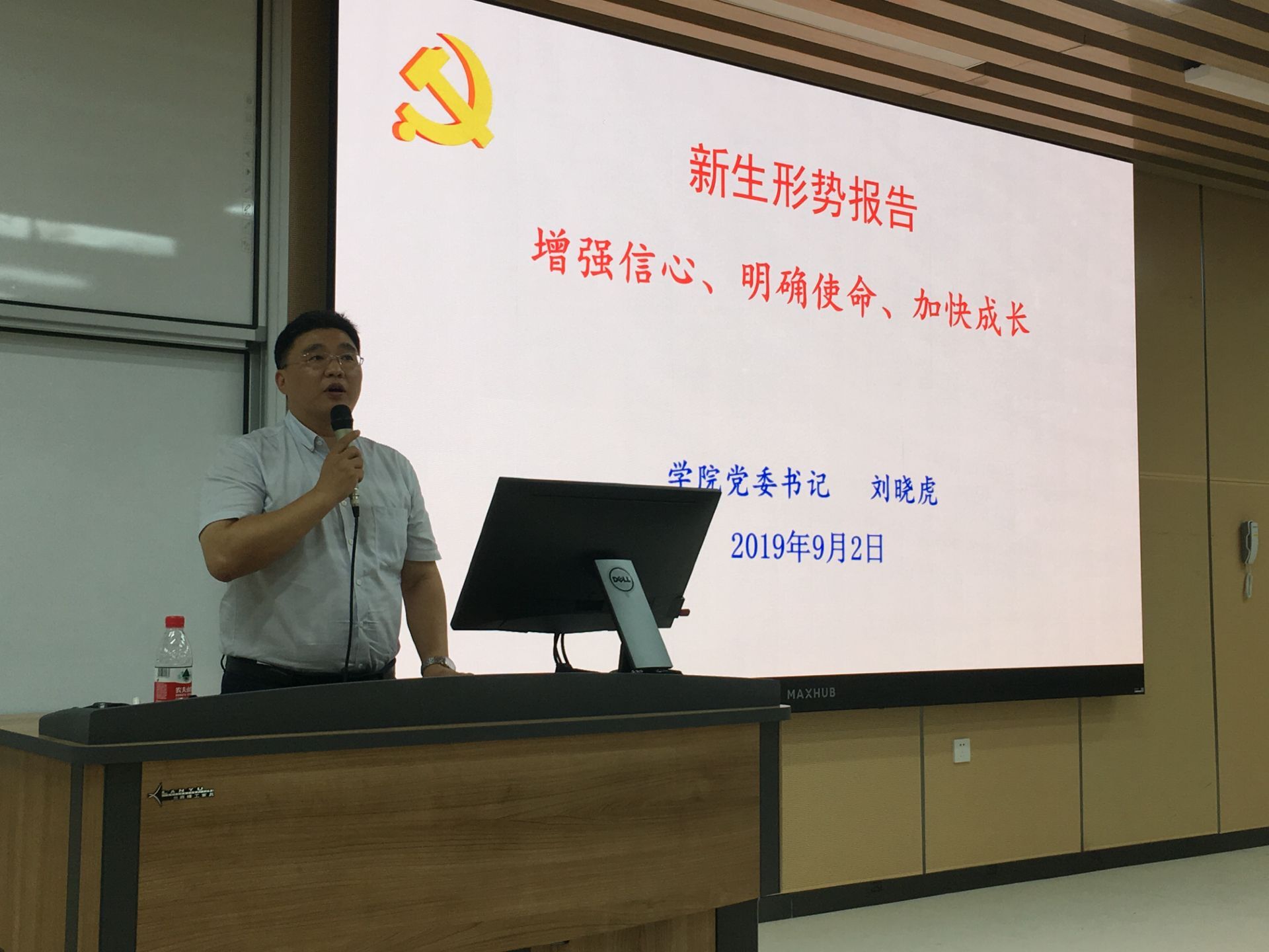 党委书记刘晓虎副教授深入本科生形势与政策课课堂,为2019级全体新生做了主题为“增强信心、明确使命、加快成长”的新生形势报告。学院党委冯国涛副书记,学生事务办公室主任、2019级辅导员贺婷老师、2019级兼职辅导员李佳丽老师,以及2019级全体新生聆听了本次报告。