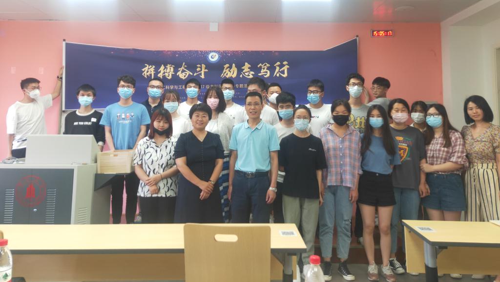 党委副书记兼2017级辅导员冯国涛老师、学院2017级本科生党支部书记暨2018级辅导员杨维老师、熊永铭及腾汶玲等两位考研成绩优异的学长代表。本次活动由2017级本科生党支部望江校区党小组组长杨恒同学主持,2017级已返校的20余名学生现场参会,其余学生线上参与。