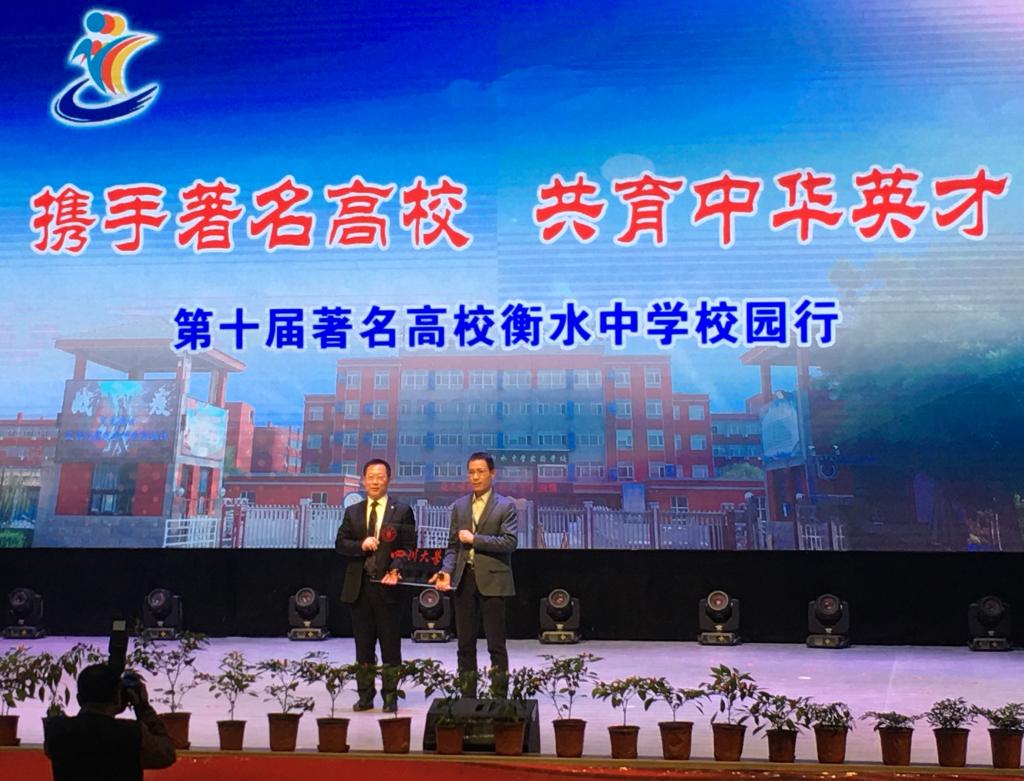 在“校园大学节”期间,参会老师参加各高中学校大学节开幕式,充分认识与了解高中的生源特点与生源优势,并与高中学校领导班子深入交流,就招生宣讲、专家报告、学生在大学期间综合表现等进行了充分交流,进一步加强与高中学校的交流与合作。同时,冯国涛副书记还代表学校授予衡水中学AV研究所