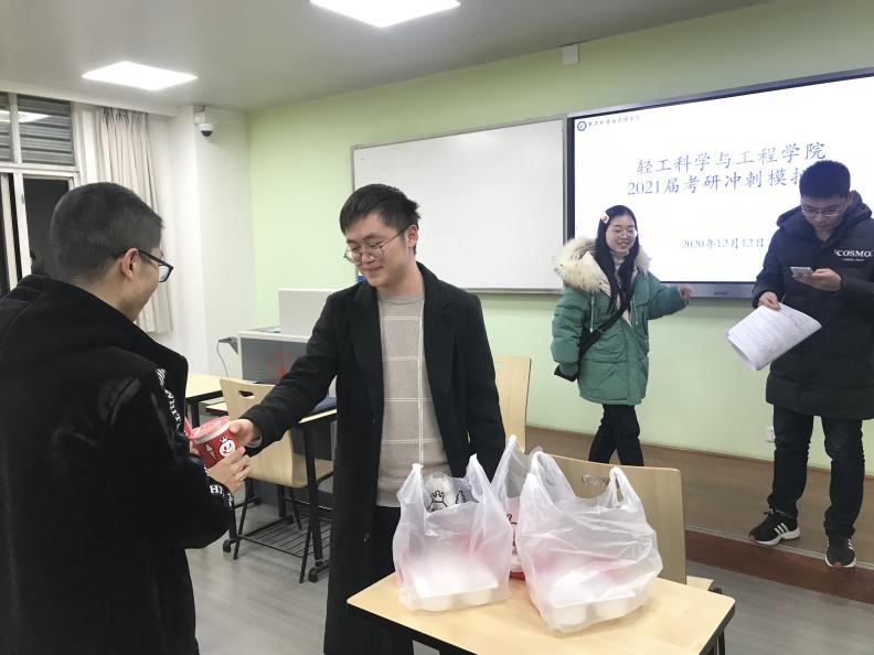 分别于11月27日、12月12日晚上7:00在基教A511举行专业课模拟考、冲刺考,两次考试均由研究生小导师任志军、熊永铭、张子洁出题,据了解,均根据去年的题型及平时的授课内容而定,即可检验大家平时的听课情况亦可巩固复习内容。考试严格按照正式考试的要求进行,如考试时长三个小时、所有参考同学分开入座等。在冲刺考结束时,小导师为每一位考研同学准备了暖心奶茶,表达了学院的关心和鼓励。