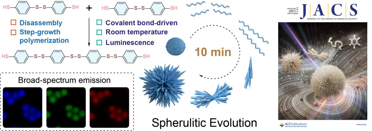 周加境研究员与加州大学圣地亚哥分校Jesse V. Jokerst教授团队合作,开发了一种在常温下通过小分子均聚和自组装形成的球形晶体聚合物(rPBDT),研究了其组装机理并证明了其用于可示踪药物载体的潜力,该研究成果以题为“Self-Assembled Homopolymeric Spherulites from Small Molecules in Solution”发表于国际化学顶级期刊《Journal of the American Chemical Society》(川大A-),并入选封面论文。研究以小分子1,4-苯二硫醇(Benzene-1,4-dithiol,BDT)为原料,BDT分子的巯基首先在碱性缓冲溶液中形成双硫键,进而逐步聚合形成聚合物链,苯环间的π-π堆积导致聚合物链组装成超分子纳米粒子(PBDT)。PBDT不仅尺寸均一(70.8 ± 8.7 nm),还可以通过种子生长法进一步生长至450 nm。将PBDT纳米粒子置于良溶剂二甲基甲酰胺(DMF)中,苯环间的π-π堆积被破坏,导致PBDT分散并暴露出活性巯基,从而通过双硫键进一步的逐步聚合形成分子量更大的聚合物链并最终结晶形成球晶(rPBDT)。该溶解和逐步聚合的过程可以在1 min内实现。通过监测rPBDT的生长过程,研究发现rPBDT链首先组装成单个尖刺,然后多个尖刺从同一个中心生长形成束状,最后大量尖刺从中心延伸发散,组装形成准球形的rPBDT球晶。通过改变PBDT纳米粒子的浓度,可制备具有不同尖刺数量的rPBDT球晶。此外,rPBDT球晶还具有优异的溶剂稳定性,在四氢呋喃(THF)中多次浸泡,形貌几乎没有改变。研究还发现,rPBDT具有在球晶领域鲜有报道的荧光特性,其原因可能是刚性双硫键和超分子结构的存在导致了聚合物链上的苯环旋转受阻,进而形成簇聚诱导发光(Clusterization-triggered emission,CTE)的现象。体外细胞毒性实验证明rPBDT球晶具有优良的生物相容性,表明其作为可示踪药物载体的巨大潜力。围绕rPBDT球晶自组装机理的研究证明了共价键在球晶形成过程中的重要作用,这也是以往研究工作中容易忽视的一个方面。