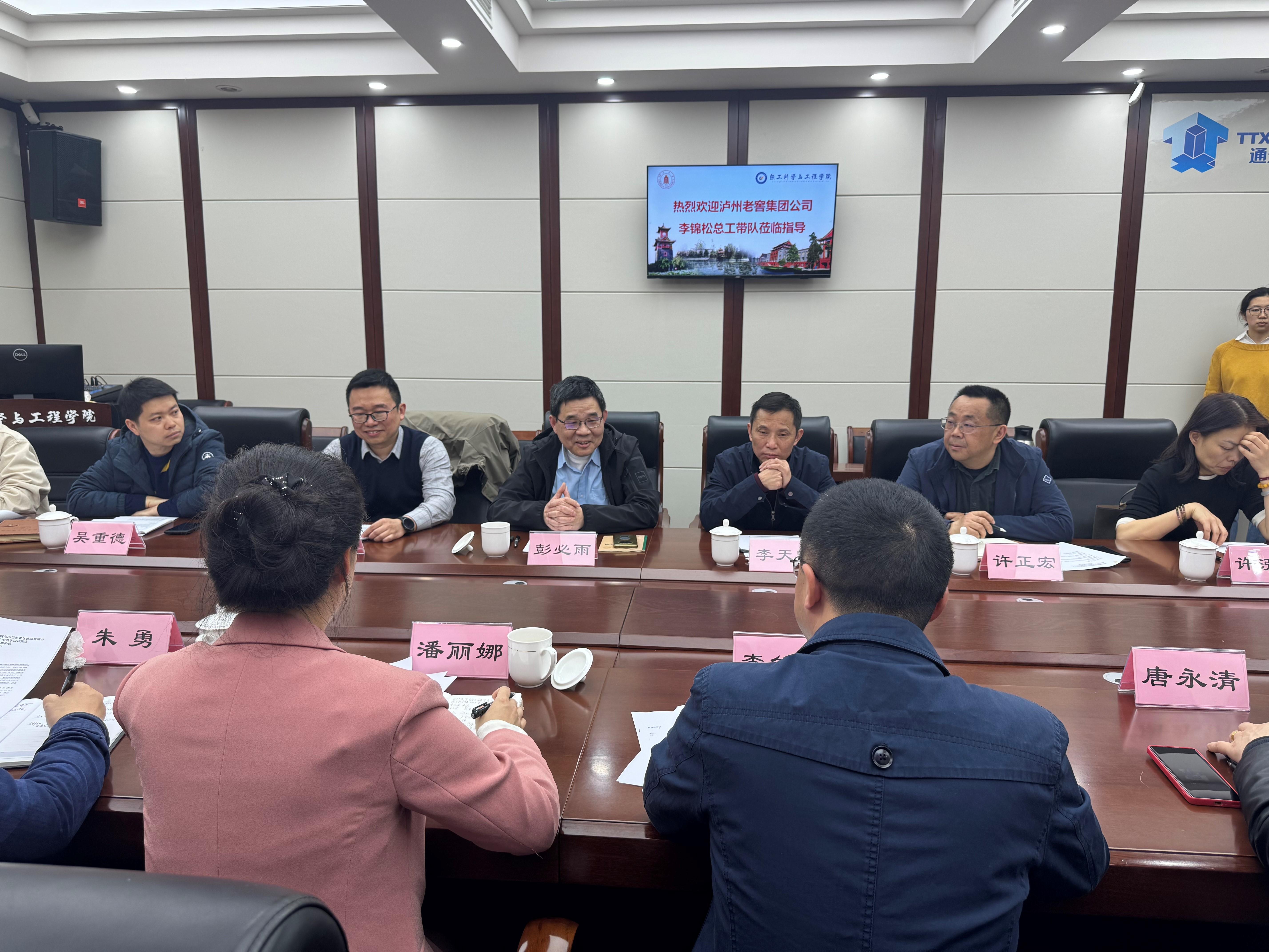 2024�3�19日,泸州老窖集团有限责任公司总工程师李锦松、泸州老窖集团有限公司党委委员元景达食品公司董事长潘丽娜、泸州老窖集团公司企业技术中心总经理朱勇,泸州先研院副院长唐永清、元景达食品公司副总经理傅其旭等领导到我院进行参观交流,并与四川大学先进酿造科技创新中心主任许正宏教授等就产业合作、学术研究、人才培养等方面展开了深入沟通�