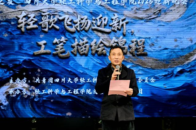 晚会伊始,学院党委书记李天富致辞,代表学院向2025级新生表示热烈欢迎,他勉励同学们主动对接国家战略需求,聚焦绿色制造、生物基材料、智能轻工等前沿方向,锤炼本领、勇于探索,在川大这片沃土中成长为有理想、有担当的时代新人。