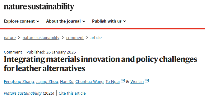 林炜教授对生物基皮革替代品(类皮革材料)面临的挑战和机遇进行了评述,相关论文以Integrating Materials Innovation and Policy Challenges for Leather Alternatives为题,发表于Nature Sustainability。文章系统介绍了生物基皮革替代品的材料组成及制备方法,深入分析了这类新型材料在产品性能和制造方面所面临的问题。文章最后探讨了生物基皮革替代品在开发和应用中的挑战,指出了潜在的研究方向,旨在为创新材料的研发提供参考。