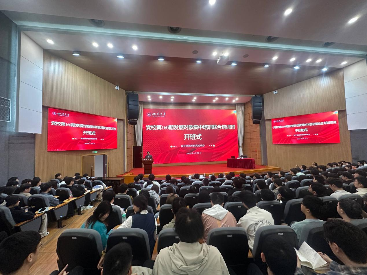 党校第160期发展对象联合培训班在望江校区西五教演播厅正式开班。本次培训由电子信息学院党校承办,电子信息学院党委书记彭舰、党委副书记兼纪委书记廖勇明、专职组织员朱莉,水利水电学院党委副书记马丹,AV研究所
