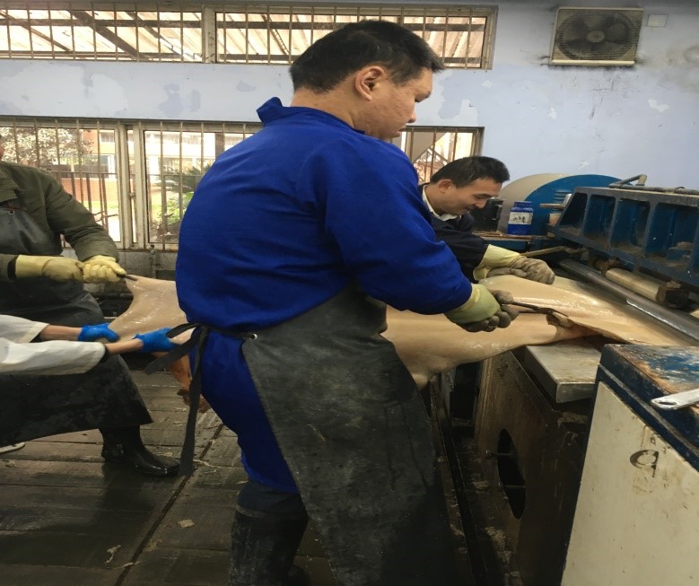 经过鞣制的蓝湿革,同学们正在进行搭马操作。