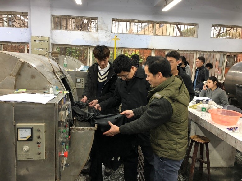 轻纺与食品学院生物质与皮革工程系组织的轻化工程专业2015级本科生皮革生产实习湿加工工段于2017年12月26日在望江校区皮革楼工艺试验室顺利完成。湿加工工段历时两周,包括脱毛浸灰,浸酸鞣制,复鞣填充,染色加脂等关键工序,实习由程海明、周建飞、陈敏、曾运航四位老师及助教张金伟博士指导进行,另有张长春和税科林老师为生产设备和化工材料提供保障。