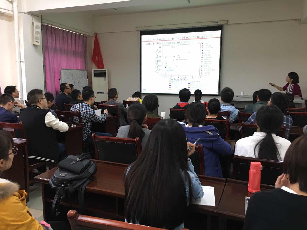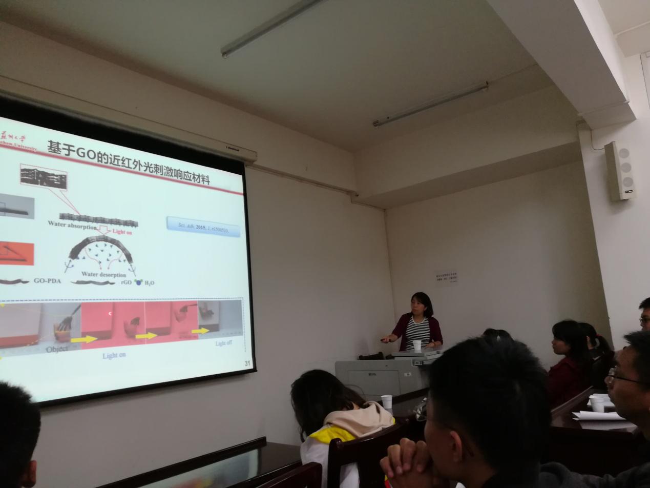 ,在南京大学获高分子化学与物理博士学位,并先后在香港理工大学和宾夕法尼亚大学从事博士后研究和担任访问学者,她的研究兴趣在于石墨烯/高分子功能材料和具有微/纳结构的导电高分子等领域。杨晓明副教授从石墨烯的历史、石墨烯复合物结构的设计及应用等方面开展讲座,报告了她在氧化石墨烯/聚合物层状结构材料的设计、制备及其近红外光响应研究的最新研究结果。杨晓明老师的报告幽默风趣,内容深入浅出,激起了在座老师和学生的浓厚兴趣。讲座期间,师生踊跃发言提问,通过与杨晓明老师面对面的交流,拓宽了AV研究所