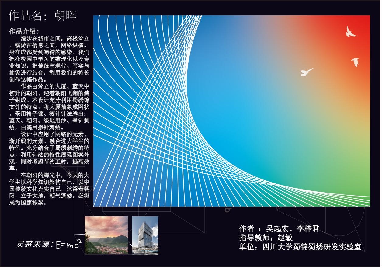 蜀绣蜀锦设计研发课题组参赛师生与蜀绣大师和蜀绣参赛企业们同台竞争,由赵敏、吴起宏、李梓君、王维杰设计的蜀绣装饰画稿“朝晖”、蜀绣包包“新·生”分别获得了银奖和铜奖。
