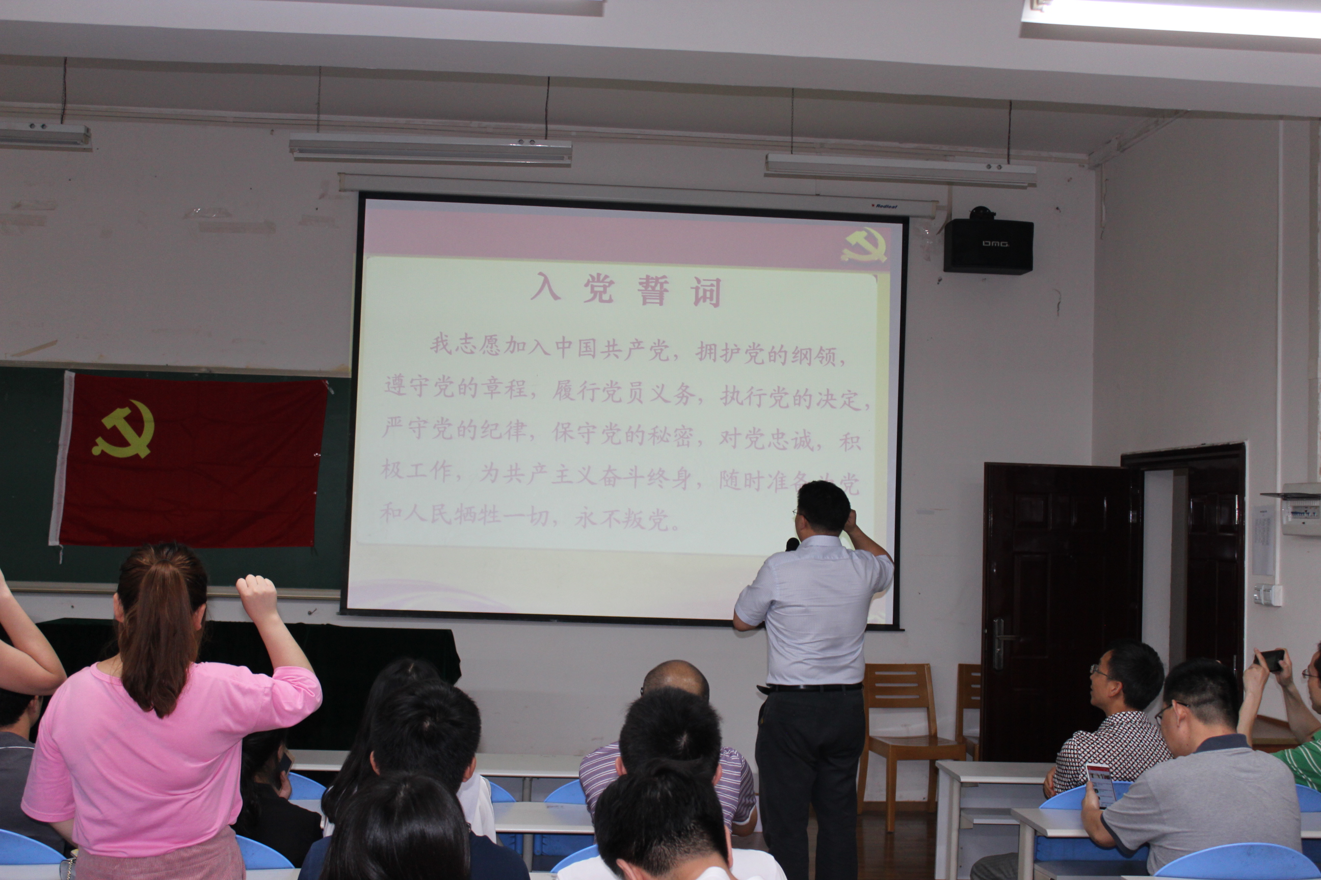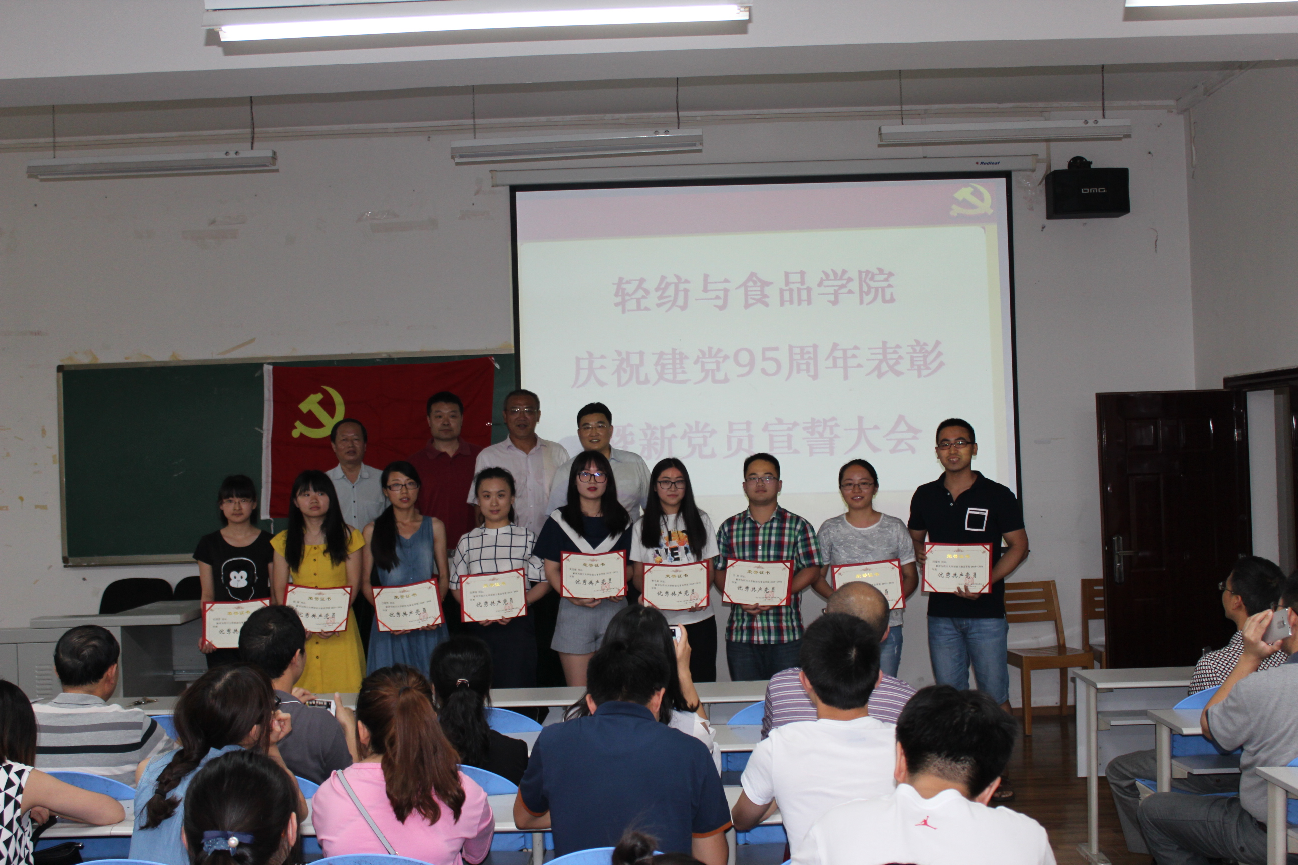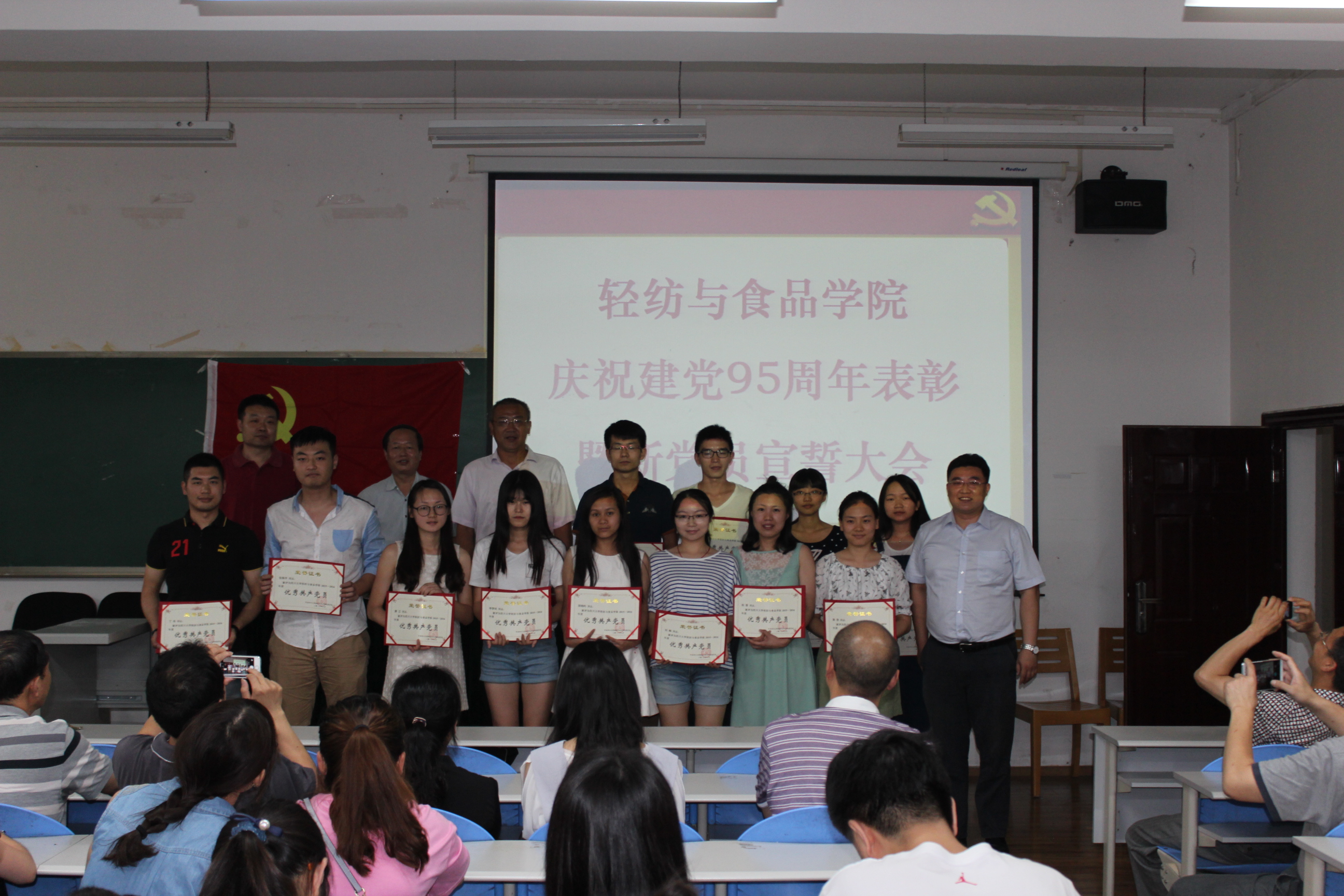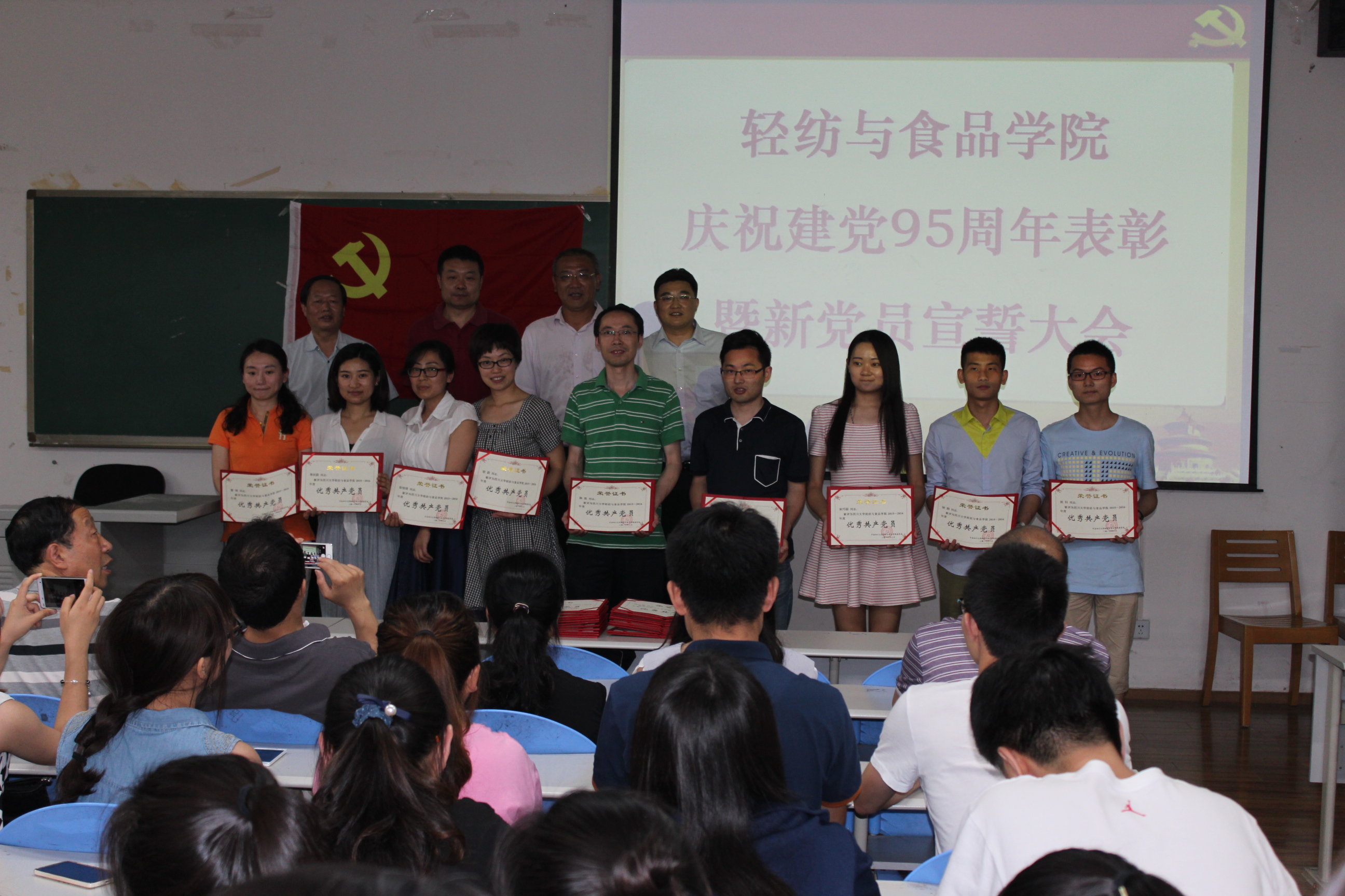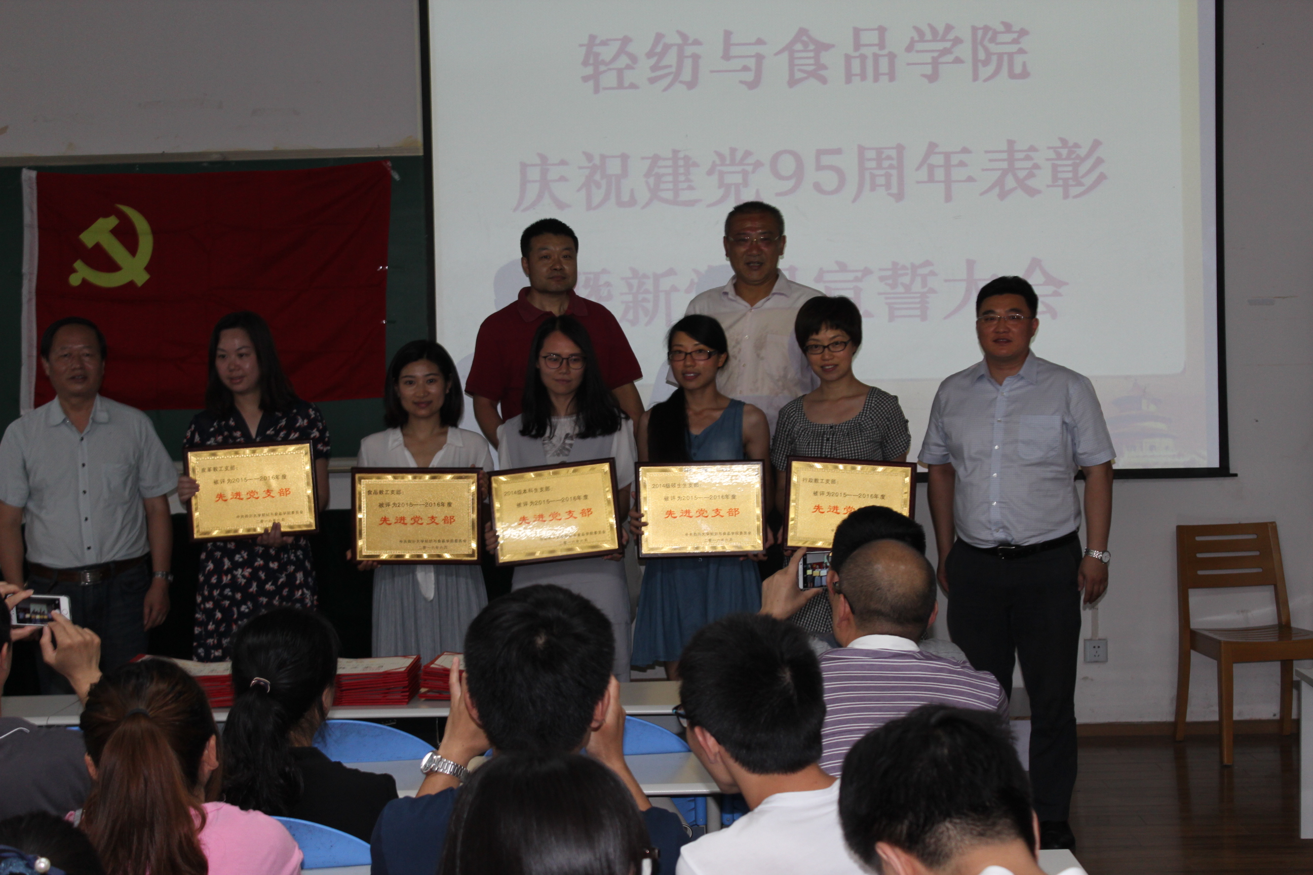 6月12日下午,AV研究所 全体党员在纺工副楼205会议室举行建党95周年表彰暨新党员宣誓大会。会议由院长何有节教授主持。他向获得表彰的支部和师生表示祝贺,希望他们再接再厉,再创辉煌。赵毅书记发表了热情洋溢的讲话,他说,今年是国家十三五的开局之年,是学校一流学科和一流专业建设之年,也是学院制定新的发展目标,实现跨越式发展的起步之年,学院党委将紧紧团结和依靠全体党员和全院师生,坚持“围绕中心抓党建,抓好党建促发展”,高举中国特色社会主义的伟大旗帜,以邓小平理论和“三个代表”重要思想为指导,深入贯彻落实科学发展观,认真学习习近平总书记系列讲话精神,认真开展“两学一做”专题教育,充分发挥基层党组织的核心作用,党支部的战斗堡垒作用和党员的先锋模范作用,不断加强理想信念教育,牢记党的宗旨,不辱使命,以实际行动来迎接建党95周年,为早日实现学校建设一流综合性大学的奋斗目标而贡献自己的力量。 接着,肖凯副院长宣读了获奖名单,学院领导为获奖的支部和师生党员颁奖。2014级硕士生党支部书记江明芳同学,作为优秀党员代表发言。最后,刘晓虎副书记作为领誓人,主持了新党员的宣誓仪式。大会圆满落幕!