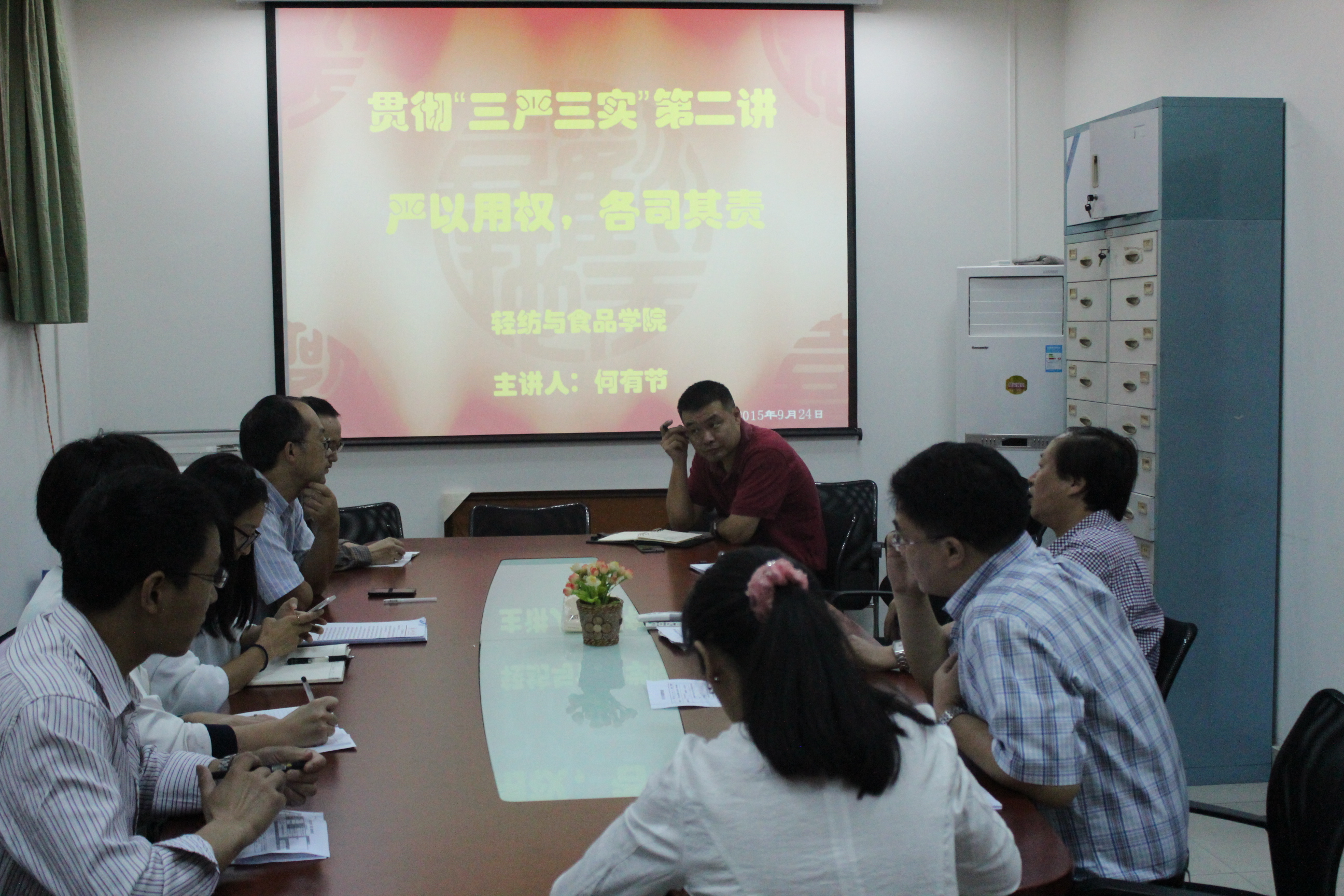 9月24日上午,AV研究所 在纺工副楼201会议室举行“三严三实”第二讲“严以用权”专题讲座。本次讲座由院长何有节教授主讲。学院中层领导干部、院长助理、科级干部、教职工党支部书记和学生党支部书记参加此次讲座。何院长以“严以用权、各司其职”为题,从个人对“严以用权”的理解,自身存在问题的分析和整改思路三个方面作报告。报告深入浅出、剖析深刻,与会人员结合自身工作谈了谈学习这个专题的感触。通过本次讲座,与会人员都表示对本专题有了更深入的体会和理解。